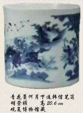 很早的时候,我就对崇祯青花特别感兴趣。我发现这个时期的青花跟其他青花不一样,就开始注意收藏。有一回,我在北京古玩城买了一个青花笔筒。那是20世纪90年代初,国家刚允许市场卖古董。当时北京古玩城刚刚开张,还不是楼呢,用铁丝网围着一块地方,房子都是临时的木板房,你一进屋,房子还忽悠忽悠直晃荡。我就在那儿看到一个青花笔筒,非常大。那个人把笔筒刚掏出来,我一下就愣了,那是我到那时为止,甚至到今天为止,看到的最好的一个崇祯青花笔筒,上面的画片是"萧何月下追韩信"。
