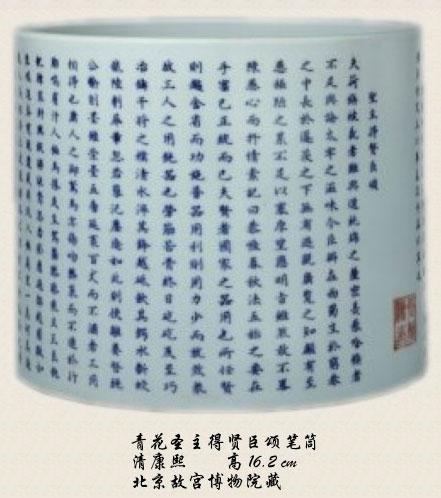 康熙中期以后,出现青花《圣主得贤臣颂》笔筒。康熙深知汉文化对中国人影响之大,不可撼动。笼络汉族知识分子,是他统治江山的必要手段。《圣主得贤臣颂》是西汉王褒撰写的一篇文章,意思是一个圣主,得了一个贤臣,两人共同治理这个国家。那么,在清初的政治背景下,《圣主得贤臣颂》就成为满汉皆能接受的一种官样文章,写在笔筒上,摆在文人的案头。