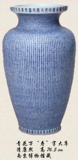 康熙中期以后,瓷器上大量书写汉字,写得比较多的就是《赤壁赋》、《醉翁亭记》、《圣主得贤臣颂》等等。再有就是康熙六十大寿时烧的青花万寿瓶。所谓"万寿瓶",就是在大瓶上面写一万个青花的"寿"字。今天写一万个"寿"字,我估计一个人得写一个月。用一万个青花寿字装饰的大瓶,故宫博物院和南京博物院各有一只。
