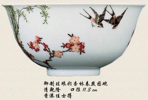 有一个著名的珐琅彩碗,画的是杏林春燕,非常漂亮。2007年在香港佳士得拍卖,当时的成交价是一亿五千多万港币。一个小碗,值这么多钱。